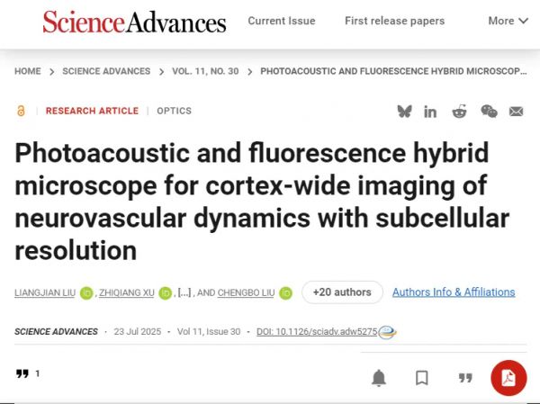 7月23日,中国科学院深圳先进技术研究院医学成像科学与技术系统全国重点实验室郑海荣院士、刘成波研究员和郑炜研究员团队,在研发第一代头戴式显微成像(Science Advances, 11, eadu1153, 2025 )基础上,实现了技术再次突破,成功研制出高速大视野光声/荧光多模态显微成像仪器(LiTA-HM),对活体小鼠全脑皮层范围内神经元活动和微血管多种参量同时、动态、高分辨成像,为非侵入式脑机接口提供了新的信息采集范式。研究成果以"Photoacoustic and fluorescence hybrid microscope for cortex-wide imaging of neurovascular dynamics with subcellular resolution"为题发表于Science Advances。该期刊同期发表期刊副主编、美国杜克大学Junjie Yao教授Focus文章,对研究进行highlight报道,评价:“ LiTA-HM将神经活动与血管生理融于同一影像,具备空间广度与时间精度,为破译大脑最基础的神经血管协作机制提供了可能。这一突破使得学界向长久以来的目标更近一步——同时以单神经元与单血管的分辨率,实时观测大脑功能与思维的律动。”