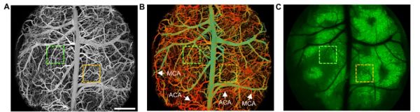 成像结果(A)小鼠全脑血管结构图;(B) 血管血氧饱和度图;(C) 神经元胞体图。标尺为1 mm