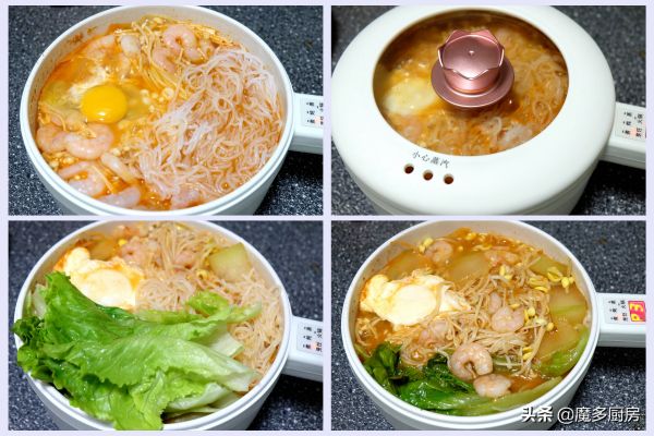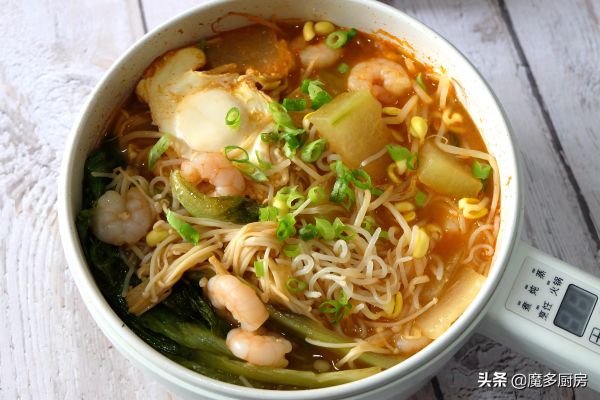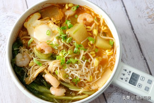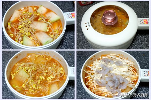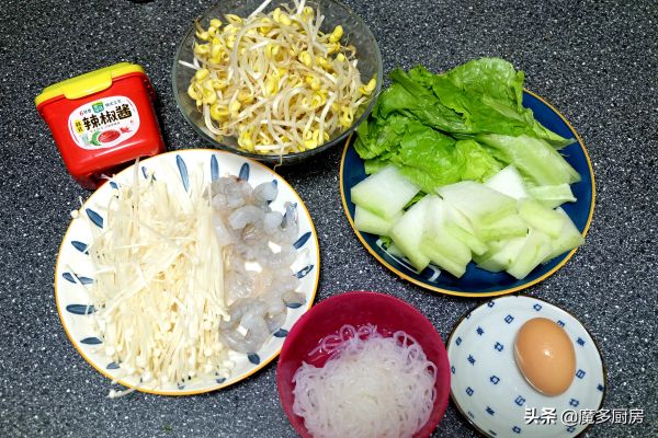 【我用到的食材和调味料】:黄豆芽、金针菇、虾仁、冬瓜、生菜、鸡蛋、魔芋丝、玉米油、大蒜、韩式辣椒酱、盐(可放可不放);