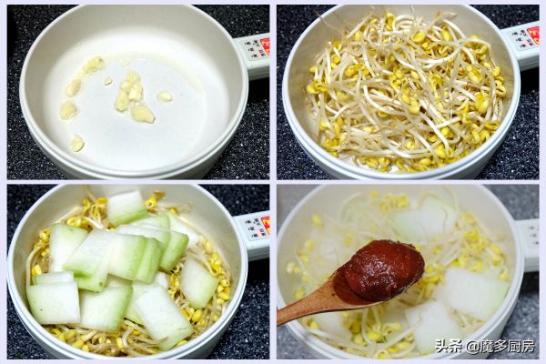 2、电煮锅通电加热,放一勺玉米油,放大蒜煎出香味,再把黄豆芽放进去翻炒断生,把冬瓜片放进去翻炒1分钟左右,放一勺韩式辣椒酱。酱的用量也可以根据自己的品味来调整,这种韩式辣椒酱是有点甜辣味的,并不是很辣。