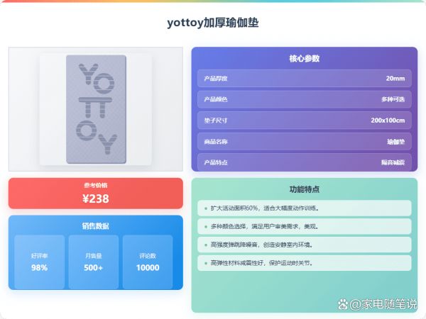 另外,如果你是喜欢在家跳操或者做一些高强度运动的,那yottoy的抗菌瑜伽垫就挺不错的,抗菌材质更卫生,而且防滑效果也更好。如果你经常和朋友一起练习,或者需要更大的活动空间,那双人瑜伽垫绝对是你的菜!但是要注意,太厚的垫子可能不太好收纳,所以选购的时候要综合考虑一下。要根据自己的运动习惯和身体情况来选择,别盲目跟风。选到适合自己的垫子,才能练得更舒服,更安心,也更有动力坚持下去嘛!