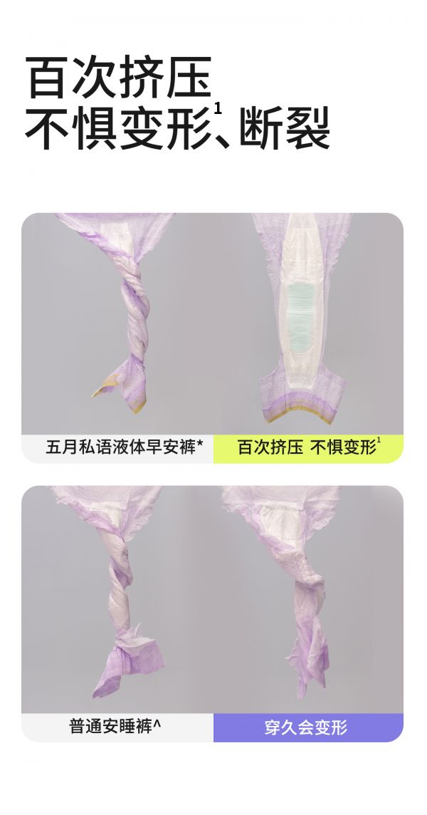 2023年,其与中国联通合作的5G智慧工厂投产,实现生产全流程数字化管控。五月私语液体早安裤采用的DUAL FLEX™液体科技,通过纤维柱状液体吸收材料实现软弹不惧变形,让用户得到无感体验。超宽魔术贴设计,穿脱无需脱掉外裤,解决了安睡裤在日间使用不方便的痛点,使女性白天夜晚只要一种液体早安裤即可方便使用。该产品还可实现挤压不惧变形、断裂,芯体通过国标3级速干的测试,能够实现8秒速吸。
