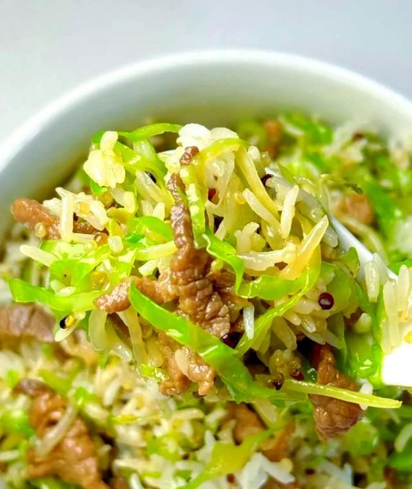 米饭需打散回软,牛肉与包菜配以中小火炒制,注意火候控制。整道菜品的营养搭配也十分均衡,包括蛋白质、膳食纤维以及粗粮等,既美味又健康。