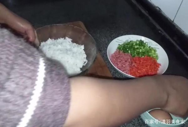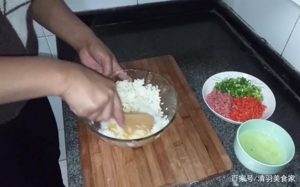 今天给大家做的是黄金炒饭,下面一起来看一下制作方法,准备的材料有米饭火腿、胡萝卜、蒜苔、鸡蛋。你好。蒜苔切成小丁。胡萝卜和火腿肠也切成小丁。打两个鸡蛋。把蛋黄取出来放在米饭里。然后把蛋黄和米饭搅拌均匀。