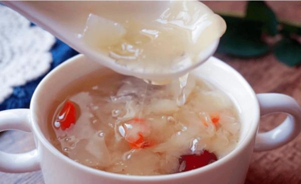 保持小火炖上十分钟左右,你会看到汤汁开始变得有点黏稠,这是银耳里的胶质煮出来了。 这时候撒上一把枸杞,再煮一两分钟就可以关火。 银耳富含植物胶质,滋阴润肺的效果很好,和雪梨是黄金搭档。 秋冬季节皮肤容易干燥起皮,或者总觉得喉咙干痒有异物感,连续喝几天银耳雪梨羹会感觉舒服很多。 它口感滑润,味道清甜,既可以当甜品,也可以代替一部分汤水。