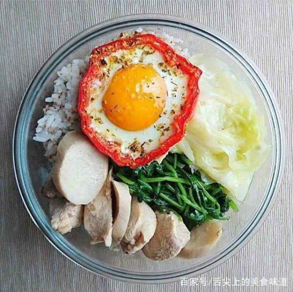 减脂餐4:彩椒煎蛋+鸡胸肉+菠菜+泡菜+杂粮饭。这道减脂餐口味较为清淡,加入了泡菜开胃。