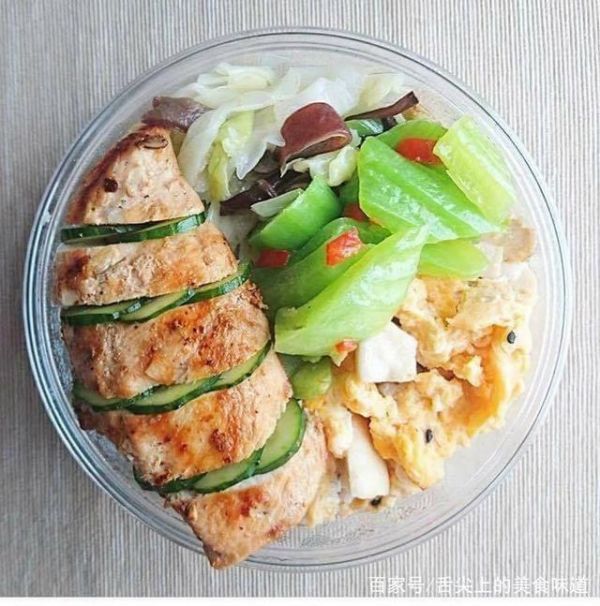 减脂餐5:香煎鸡胸肉+炒鸡蛋+芹菜+黄瓜+杂粮饭。鸡胸肉煎过之后与黄瓜摆盘别有一番风味。