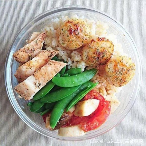 减脂餐7:鸡胸肉+荷兰豆+西红柿+煎虾球+杂粮饭。