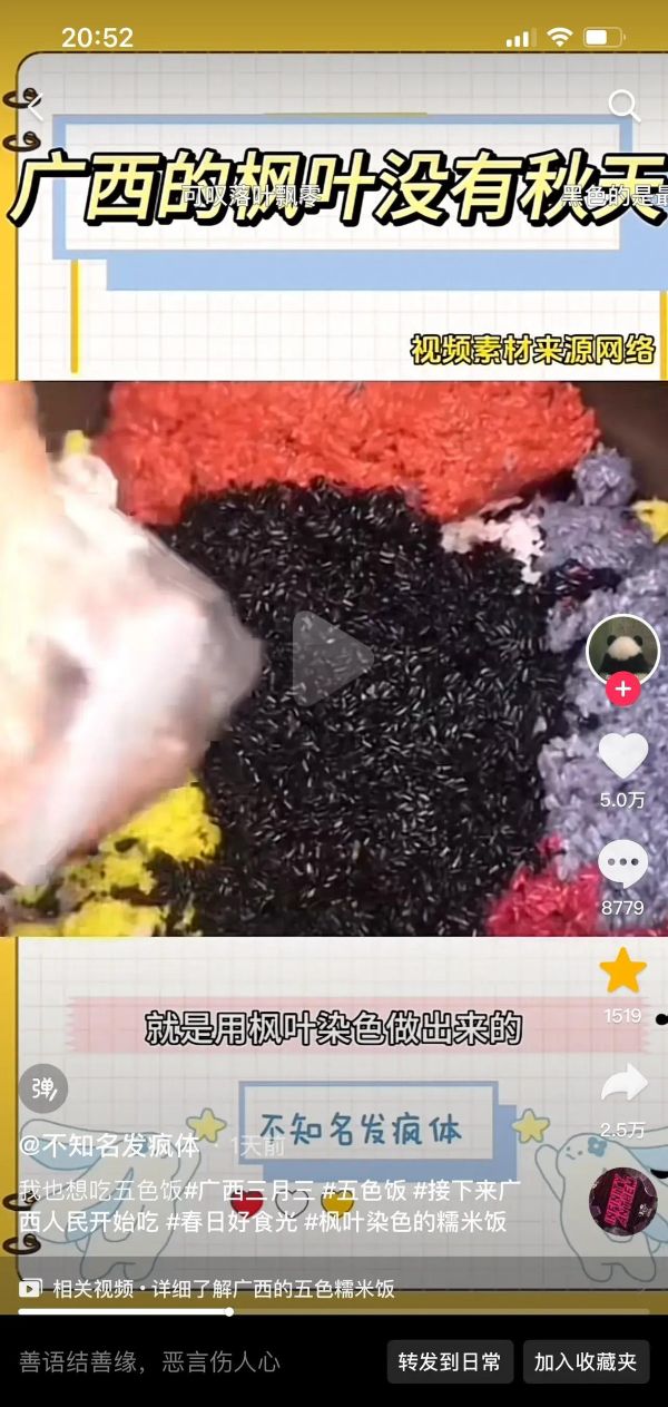 广西的枫叶一直是这个省份的特色之一,但却有一个独特之处:它们从来不会变红。相比于其他省份的红枫叶在秋天中如火如荼地绽放,广西的枫树却长得不太好,少有变红的情况发生。因此,广西人在三月三这一节日时,会利用枫叶进行染色,制作出五色饭中的黑色糯米饭。