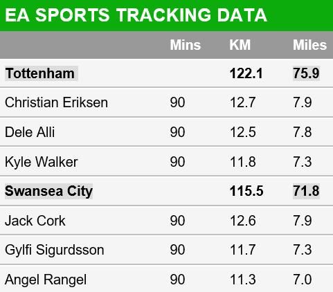 但是更加诡异的是他们的控球率只有55%左右,排名全欧第17位,在不控球的情况下赢得比赛,小编仿佛看见了热刺球员满场飞奔的身影。的确,在3天2战的情况下,热刺主力尽出依然交出了122.1公里的跑动距离,要知道毫无欧战任务的斯旺西城只有115.5公里!不想争冠的球队,怎会有此等数据?