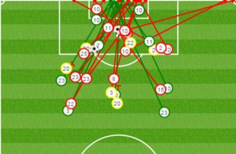 热刺在本次比赛中迸发出来的能量是惊若天人的,图1是主队的射门位置,小编仔细数了数图中细线的条数,居然有吓人的34条。没错,今场比赛热刺一共录得34次射门,这是一个创队史的数据,而超过15次射中门框范围之内。俗话说,“要看一个人强不强,不能看他取得的成就,应该看他的对手有多强。”是的,我们可以从图2看出热刺攻击群状态之火热。而图2正是是天鹅城门将法比安斯基的镇守范围,可见后者在18码线附近疲于奔命,为了力保斯旺西城的后场能够顺利轮转以抵御一次又一次的冲击,他甚至多次奔袭到禁区前沿。根据权威足球网站Whoscored.com统计,热刺的场均射门数位列全欧第5,榜单的前4分别是拜仁(20.6)、皇马(19.2)、曼城(17.3)和那不勒斯(17.3)。