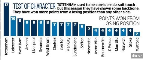 更甚的是,波切蒂诺还给这支球队注入了血性的元素,图3是迄今为止英超各队在本赛季落后的情况下逆转获取的分数,热刺以17个积分位列榜首,以铁血著称的曼联仅排在倒数第2位与保级队维拉为伍,不知道魔迷看到这个图表时的心情如何。只能说,在一个球队里面,教练的位置是所有人无所替代的,就算是群羊在狮子的带领下也能打出狮子的风采,而狮子在羊的带领下仅能像1只羊一样战斗。接下来,热刺要接连面对西汉姆和阿森纳,欧洲赛场又要迎战多特,属于波帅的挑战才刚开始。