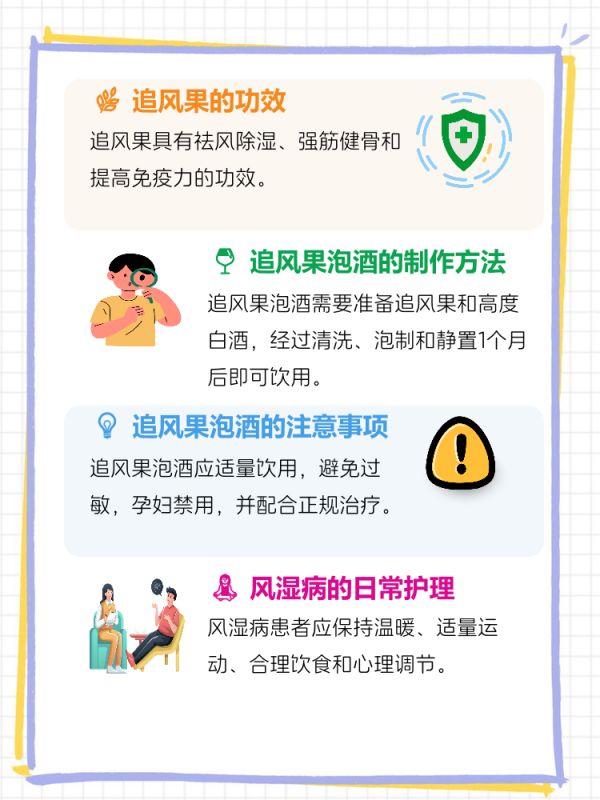 4. 配合治疗:追风果泡酒虽然有助于缓解风湿病症状,但不能替代正规治疗。患者应在医生指导下进行综合治疗,结合药物和物理疗法,达到最佳治疗效果。