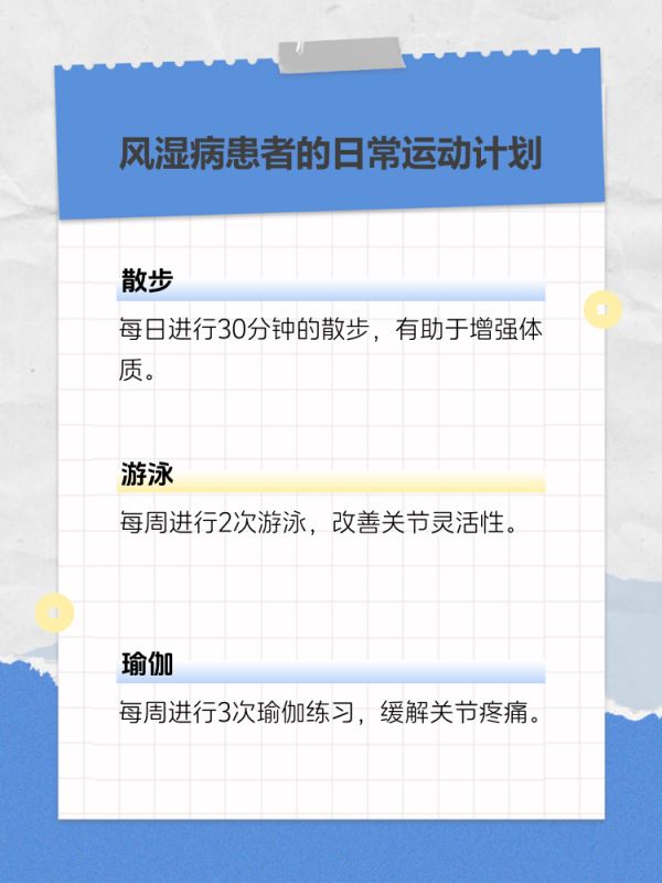 2. 适量运动:适量的运动可以增强体质,改善关节的灵活性。选择低强度的运动,如散步、游泳等,有助于缓解风湿病症状。