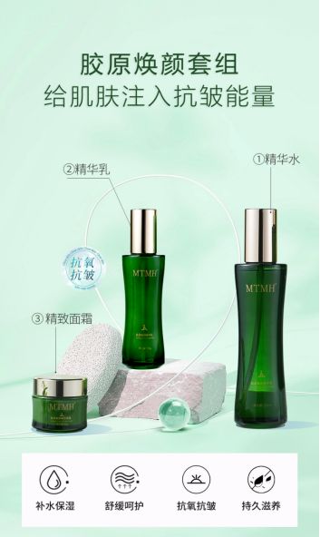 目前MTMH主推的胶原焕颜系列,就是融入了大量传统草本精华,例如库拉索芦荟叶、欧锦葵、马齿苋等常见又珍贵的草本植物,经过精心萃取,成为了护肤的关键成分。它们不仅饱含草本中的各类营养素,更重要的是性质温和,不会对肌肤产生刺激,为肌肤提供充足的营养与滋润。此外,人参提取物、粉防己提取物和龙胆提取物等多种草本成分的加入,使得这系列的产品功效更为强大。它们相互协同,能够深入肌肤底层,有效舒缓修护,抗氧抗衰,给肌肤带来全方位的滋养。