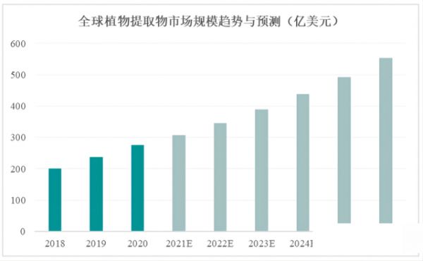 根据Markets and Markets数据显示,预计2021年全球植物提取物成分市场为308亿美元,并将于2026 年达到553亿美元,复合增长率为12.42%。