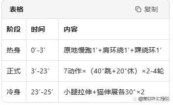 ③ 跳前热身3′(原地慢跑+肩环绕),跳后拉伸2′(小腿+腰背)