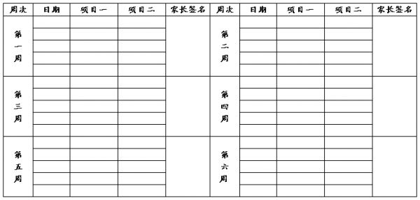 ①锻炼周期为六周,每天自选2项,每周练习5天,练习前的热身活动一定要充分、准确、到位(学生自己安排锻炼时间,早上或者晚上,每天一小时,具体内容自行安排,劳逸结合,练习时注意上下肢锻炼合理搭配)。②根据学生锻炼情况,家长亲自填写锻炼记录表,每周签名一次。(见下表)。③因身体或其它原因不能参与或完成锻炼任务,请家长在该日期栏内注明缘由。