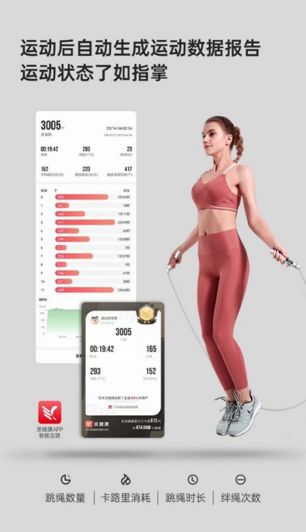 与此同时,当75派智能跳绳连接上派健康APP,智能运动数据功能将被充分激活,通过人工智能和大数据加持,派健康APP不仅可以实时记录跳绳次数、时长、卡路里消耗、绊绳次数、最大连续跳绳次数、最快频次等维度的运动数据,更可以通过大数据进行智能运动分析和压力监测,还能够为用户推荐有针对性的训练计划,帮助用户可以在了解自己运动强度和运动水平的同时,制定循序渐进的健康运动计划,让日常运动健康状况一手掌握。
