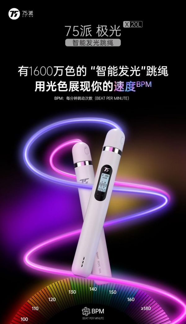 75派最新推出的极光X20L智能发光跳绳,也创新地推出了用颜色代表速度的直观方式,其集成了包括智能运动组件、数码运动发光组件以及运动计数算法在内的三大智能黑科技,让发光跳绳可以随着你的速度而变化。当跳绳速度从0到180次/分钟,发光跳绳会依次呈现红、橙、青、蓝、紫色;超过180次/分钟,发光跳绳会自动解锁7种色彩快速切换的极光模式。既能方便地让跳友随时掌握自己的速度区间,又能通过有趣、时尚的互动和视觉方式,让春日运动的你成为夜晚最个性闪耀的发光体!