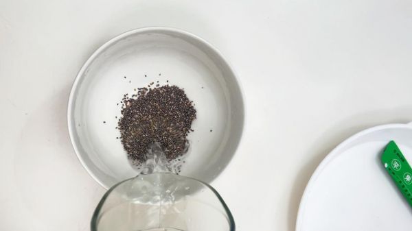 步骤4、接着来冲泡奇亚籽,半碗水加10克左右的奇亚籽,水温的话最好在60度左右,