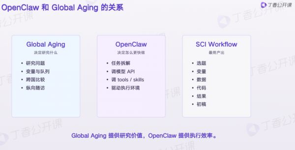 也就是说,Global Aging 决定你研究什么,OpenClaw 决定你怎么更快把它做出来。