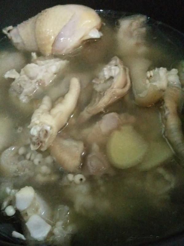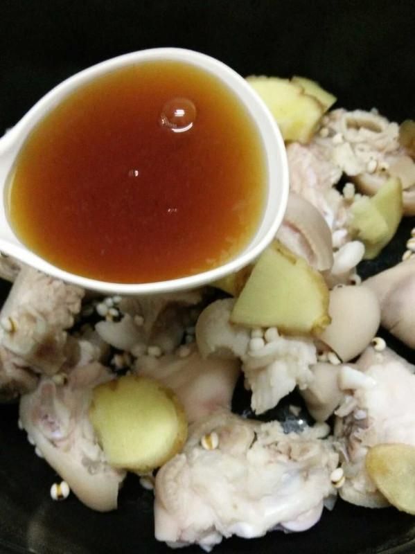 猪蹄 500克、薏米 2把、姜 1块、黄酒 1勺、精盐 适量、葱 1根、鸡腿 1个