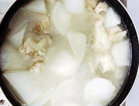 第四步,待骨头差不多炖了一个小时的时间,便可将白萝卜放入在锅中,继续炖,直到将白萝卜也炖熟,这个时候看到锅面的浮油,用勺子将其撇干净;