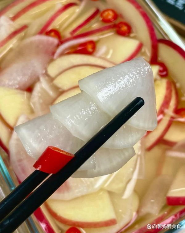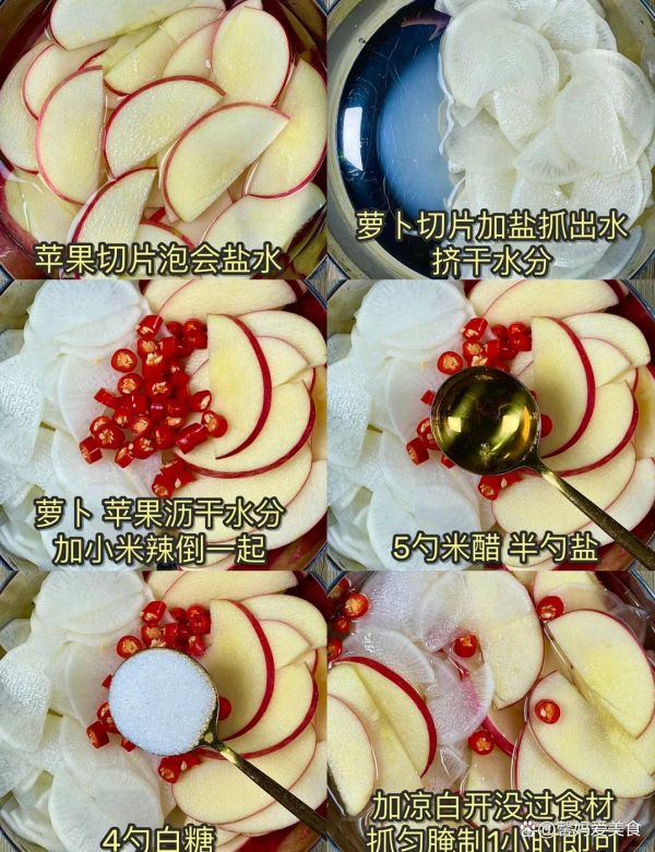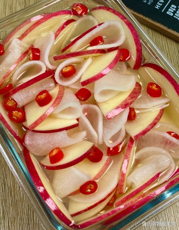 3.混合食材:将处理好的白萝卜和苹果片放在一起,加入适量的小米辣、5勺米醋、4勺白糖和半勺盐,搅拌均匀。