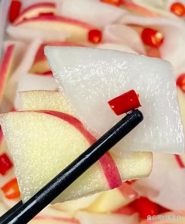 除了独特的口感之外,这道菜还有很多健康益处。苹果富含维生素C和膳食纤维,有助于促进消化和增强免疫力;白萝卜则具有清热解毒、健脾开胃的作用;米醋不仅能增加食欲,还能帮助分解脂肪,减轻肠胃负担。再加上一点小米辣的刺激,整道菜既能开胃又能助消化,实在是非常健康的美味小菜。