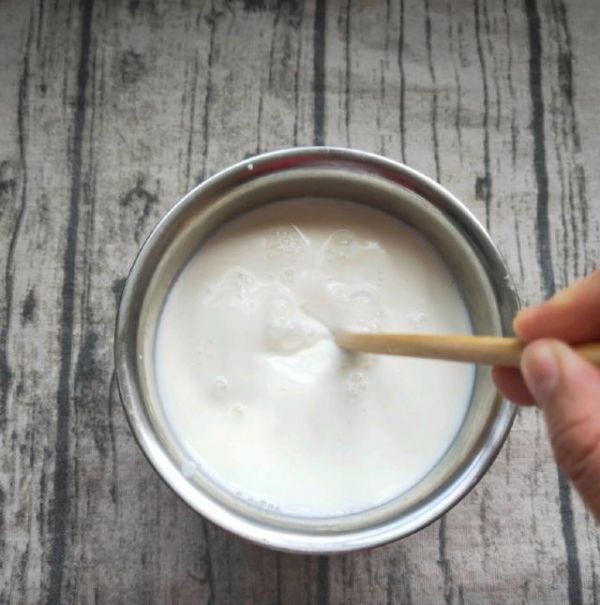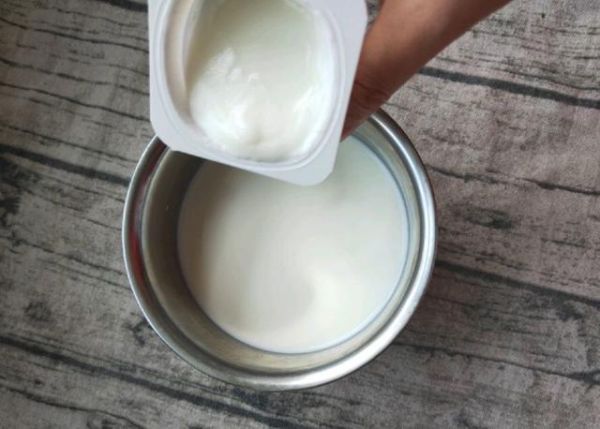 2:找一个干净无油无水的容器,把准备好的酸奶和牛奶倒入容器中。