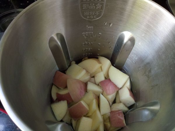 2.香蕉去皮、切块;苹果洗净,切块;黄豆洗净;以上材料都一起加入破壁机,再加水到1000毫升的刻度线。