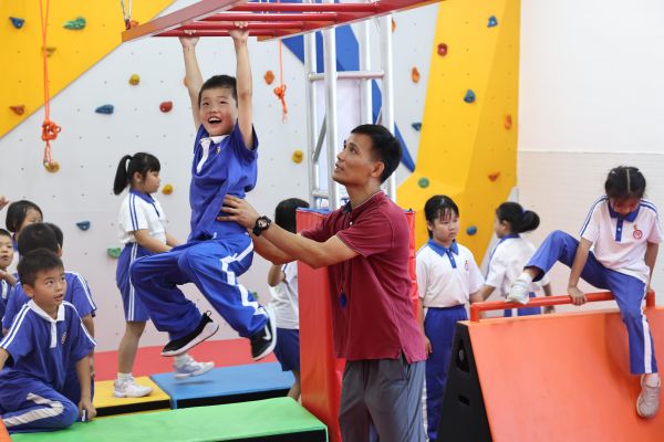 小学部则采用更具衔接性的 “3+1+1”体育课程模式:每周3节常规体育课,夯实基础技能;加1节在专业体能教室进行的特色体能课,一至四年级学生进行攀岩、障碍训练,五至八年级则开展划船机体能训练,全面提升身体素质;再加1节体育教师专业走班课,让学生从小学阶段就开始接触和体验不同运动项目。四年级学武术、五年级学乒乓球……一年一专项,循序渐进,既保证了运动技能的持续积累,也为初中的选课走班打下了坚实基础。
