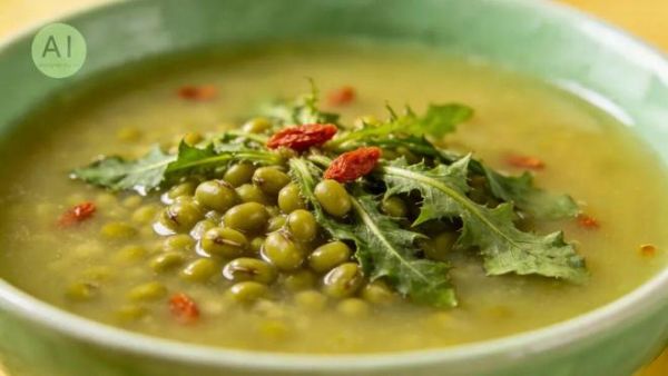 3.新鲜蒲公英洗净,切碎,在绿豆汤即将煲好前5分钟加入。最后根据个人口味加入适量冰糖,搅拌至溶化即可。