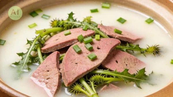 用料:新鲜蒲公英100克,猪肝150克枸杞子10克,生姜3片,料酒、盐、香油适量。