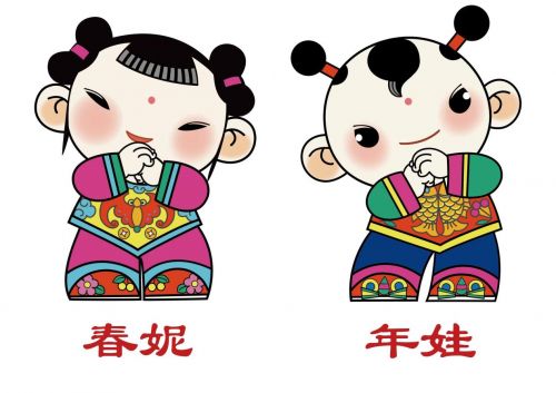 中华春节符号还有一对吉祥娃娃——“年娃”和“春妮”。它们的设计创意源自传统文化的“金童玉女”,是春节吉祥喜庆的象征,有招财、开运、纳福、平安等寓意。男左女右且略呈弧形的身形布局切合了“左阳右阴”的和合传统,蕴含了阴阳太极的对立统一。其造型饱满、圆润,并沿用传统的发型头饰:肚兜上装饰的“蝙蝠”“双鱼”图案,意为“福庆(蝙蝠)有余(鱼)”,表达了人们对来年美好前景的向往:“虎头鞋”和“绣花鞋”也有“春天即至、避邪祈安”的意思。两个可爱的“萌娃”都行拱手礼,既表达了人们辞旧迎新的美好祝愿,也体现了男女平等的时代新风。