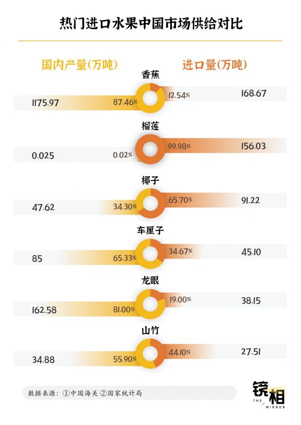 尽管中国的水果产量丰厚,但中国仍然是水果的净进口国,2024年进口量818.4万吨,是出口量的1.5倍。一方面,消费者想要吃到非当季的、多品种的水果;另一方面,水果卖家想延长销售期、减少耗损率,而进口水果商业化程度高,自然就成了两全其美的选择。如今,中国市场上的水果消费有7%依赖进口。