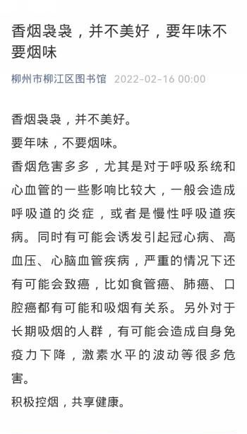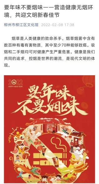 一是利用“柳州市柳江区文化馆微信公众号”以及“柳州市柳江区图书馆微信公众号”为载体开展宣传活动。2月8日在“柳州市柳江区文化馆微信公众号”发布“要年味不要烟味——营造健康无烟环境,共迎文明新春佳节”,2月16日在“柳州市柳江区图书馆微信公众号”发布“香烟袅袅,并不美好,要年味不要烟味”,号召大家树立良好的生活习惯,以不吸烟、不敬烟等健康行为守护家人健康,共度无烟佳节。