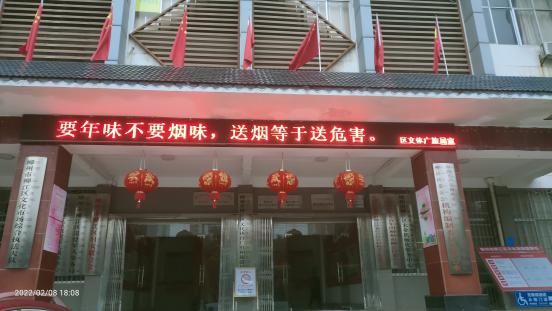 二是利用电子屏为载体开展宣传活动,2月8日开始在柳江区青少年活动中心大门LED宣传屏滚动播放“要年味不要烟味,送烟等于送危害”的宣传标语,进一步倡导文明健康绿色环保生活方式。
