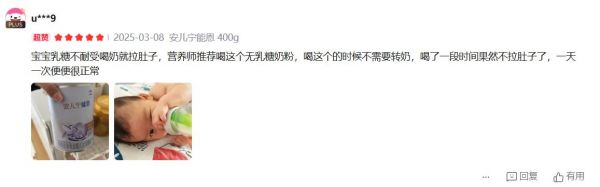 还有江苏的宝妈留言:“宝宝乳糖不耐受,喝奶就拉肚子,营养师推荐喝这个无乳糖奶粉,喝这个的时候不需要转奶,喝了一段时间,果然不拉肚子了,一天一次大便,很正常。”
