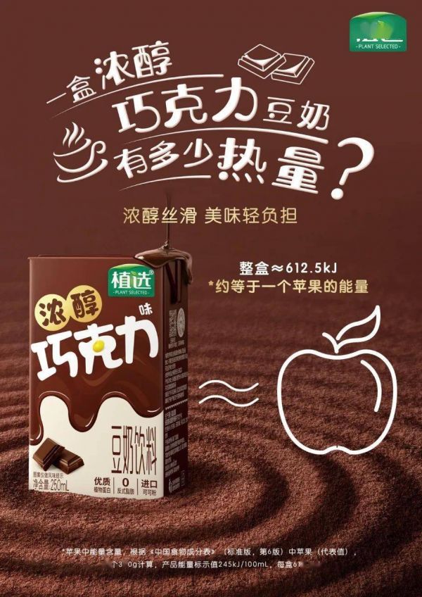 植选浓醇巧克力豆奶0反式脂肪,每包能量含量约相当于1个苹果的能量含量,营养无负担还兼具美味,让消费者可以更享美味,更少负担。