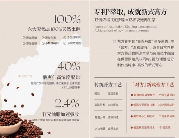 对方传承中医“复方”调理的核心,从传统“经典方”中汲取灵感,辨证优化成适合现代人的“创新方”。将药食同源天然成分与尖端萃取技术融合,制作出针对失眠、熬夜、气血、疲劳的天然、纯净、高效的「新式膏方」。