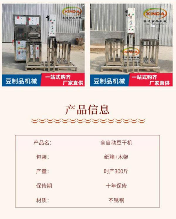 产品特性新型加工定制是种类豆干品牌鑫达适用范围休闲食品厂设备售后服务十年保修型号xd-748产品用途豆制品加工厂电压220V功率1.5kw外形尺寸1300*1900*1300mm净重200kg包装纸箱+木架规格小型