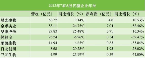 近年来随着无糖饮料的风靡,以赤藓糖醇为代表的甜味剂进入消费者视野,相关代糖企业也迎来扩张。自2022年底开始,代糖行业面临产能过剩困境,一直延续至2023年。新京报记者近期梳理A股7家主营代糖业务企业的2023年年报发现,保龄宝、三元生物、金禾实业3家企业的营收、净利双双下滑,且净利润下滑幅度均超过50%,莱茵生物则是增收不增利,净利润减少五成多,晨光生物、华康股份等3家企业实现营收和净利的双丰收。