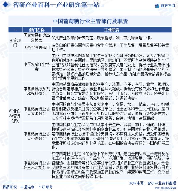 葡萄糖主要通过淀粉水解过程实现,淀粉可以来自玉米、小麦、马铃薯、稻米等植物源。中国对玉米、小麦、马铃薯等粮食作物进行深加工行业的监管采取国家宏观调控和行业自律相结合的方式。国家通过国家发展和改革委员会、农业部、国家粮食局等主管部门规范行业发展,中国发酵工业协会、中国食品添加剂和配料协会、中国粮食行业协会大米分会、小麦分会、玉米淀粉分会等组织进行行业自律管理。