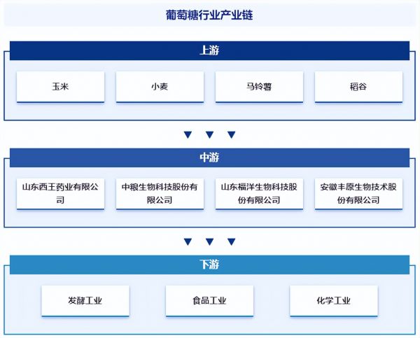 葡萄糖行业位于中游,其作用主要有增强记忆力、刺激钙质吸收、刺激软骨细胞合成蛋白多糖和胶原纤维从而促进修复软骨等,因此,行业下游主要应用于发酵工业、食品工业、化学工业,还可通过氢化、氧化等化学反应转化为其他物质。