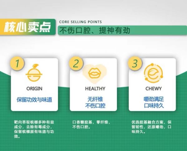 槟榔作为在中国流行千年的消费品,确一直用粗糙的纤维在伤害着消费者的口腔,槟榔口香糖保留了传统槟榔干果的功效,去除了有害的纤维,以口香糖的形式出现在消费者面前。