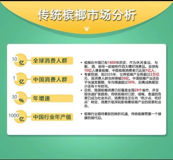 之前经过调研,一个300万常驻人口的城市,槟榔的月销量在3000万左右,可见消费人群之大,哪怕100个吃槟榔的人,有5个愿意接受更健康的元味初醒槟榔口香糖,这个市场销量也是一个巨大的增长空间。