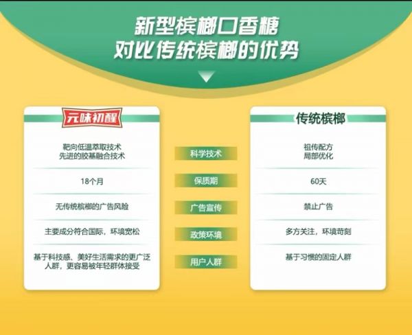 经过两年的研发,在今年元味初醒的科技槟榔口香糖,终于出来和各位见面了,采用了进口的胶基来还原槟榔的嚼劲,留香能长达10来分钟;