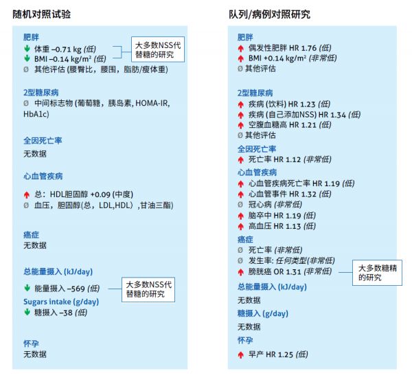 前瞻性队列研究结果表明,较高的NSS摄入量与体重增加、2型糖尿病、心血管疾病和全因死亡风险增加相关(非常低到低确定性证据)。病例对照研究的结果表明:糖精摄入与膀胱癌之间存在关联(非常低的确定性证据),但在病例对照研究或前瞻性队列研究的荟萃分析中未观察到与其他类型癌症的显著关联(非常小到低的确定度证据)。
